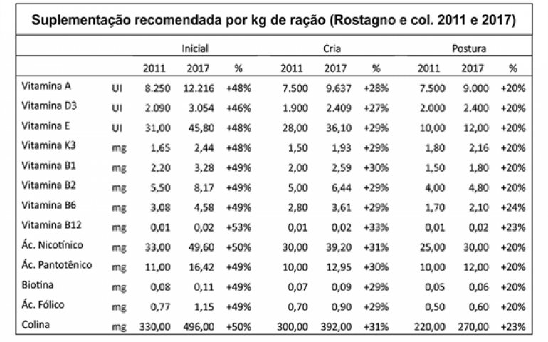 Recentemente foram publicadas as novas Tabelas Brasileiras para Aves e Suínos da Universidade Federal de Viçosa (Rostagno e col., 2017), com uma revisão importante dos níveis vitamínicos recomendados para poedeiras, em relação à edição anterior (Rostagno e col., 2011).