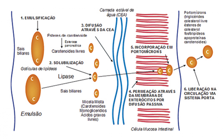 A absorção de carotenoides no trato intestinal está associada aos mesmos eventos que ocorrem com os lipídios e vitaminas lipossolúveis da dieta em nível de lúmen, membrana intraluminal e intracelular. Apesar das lacunas em nosso conhecimento sobre a absorção de carotenoides em aves, parece provável que a maioria dos carotenoides é absorvida no jejuno. A figura 1 (Surai, 2015) mostra um esquema geral da absorção intestinal dos carotenoides.