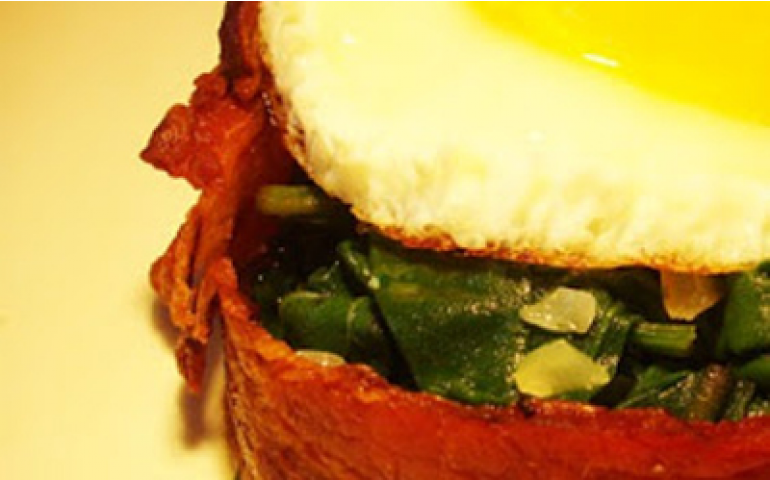| Ovo frito com bacon e espinafre: sabor marcante |
