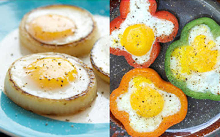 Para fazer o ovo decorado basta cortar uma fatia grossa da cebola ou do pimentão e grelhar de um lado. Quando virar, quebre o ovo dentro e deixe-o até chegar ao ponto de sua preferência.