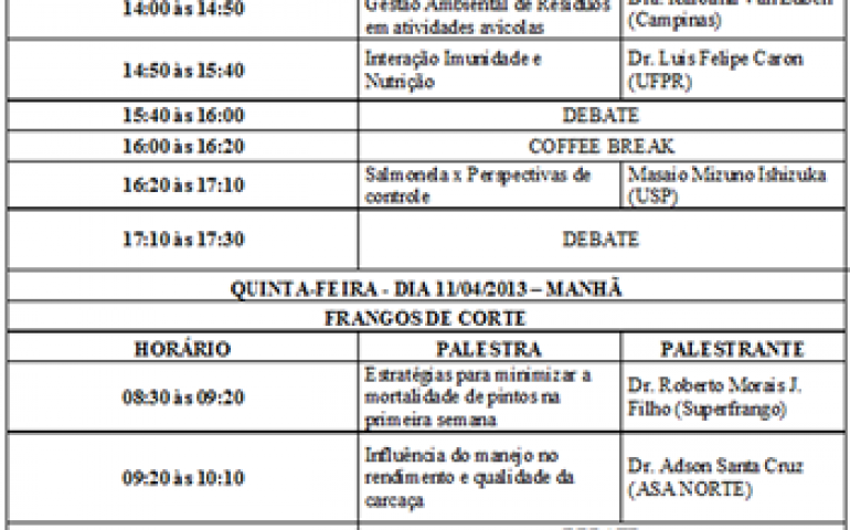 O simpósio conta com a presença de pesquisadores e empresas de grande renome mundial e os temas relativos à avicultura serão abordados por meio de debates e palestras. Segundo informa a organização do evento, “o simpósio é fruto de um esforço conjunto de avicultores e técnicos da área, que trazem a experiência dos simpósios anteriores, que lograram pleno êxito e boa repercussão no meio avícola”. É baseado nesse conceito que a comissão organizadora do XI Simpósio Goiano de Avicultura direcionou a edição deste ano de forma a contemplar seu público-alvo, os avicultores, com temas da atualidade para a área.