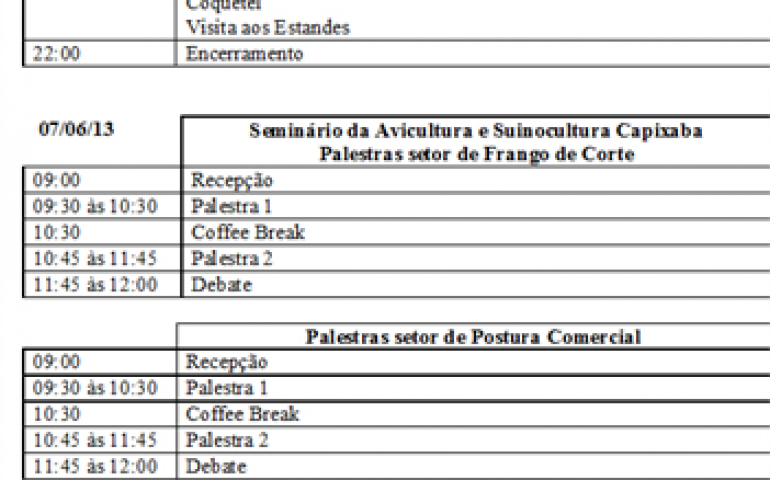 Também informa a organização que, uma vez que reúne os setores de postura comercial, corte e suinocultura, foi organizada uma palestra-âncora direcionada aos três setores e relacionada ao agronegócio brasileiro, com foco também nas perspectivas internacionais. “Além disso, ocorrerão seis palestras segmentadas (frango de corte, postura comercial e suinocultura), vitrine da carne, minicursos, aulas-show e feira gastronômica, atraindo não apenas pessoas relacionadas aos três setores mas, também, proprietários e funcionários de hotéis, pousadas, restaurantes, enfim, um público-cliente de ovos, aves e suínos em suas empresas. Os estudantes são outro foco de atenção da Feira do Espírito Santo, já que eles são os futuros profissionais do mercado e poderão, assim, interagir com a cadeia produtiva.