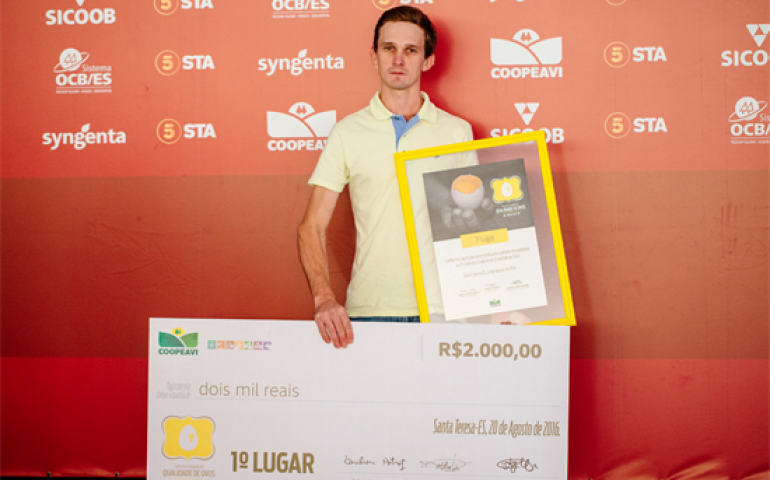 Além de Fábio, outros dois avicultores foram premiados: Laurentino Krüger e Marciel Guering. No total, foram distribuídos 4,5 mil reais em premiação para os três melhores. “Estamos criando uma identidade e um padrão de qualidade dos ovos produzidos em Santa Maria de Jetibá; este concurso contribui muito para isso”, avaliou Nelio Hand, diretor executivo da AVES, a Associação dos Avicultores do Espírito Santo. A entidade apoiou o II Concurso de Qualidade de Ovos do Espírito Santo realizado pela Coopeavi.