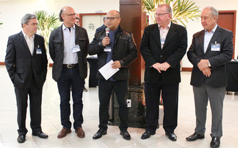 | Eduardo dos Santos recepciona convidados do evento, junto a Ricardo Santin (ABPA), Cesar de Anda (IEC), Nestor Freiberger (Asgav) e Francisco Turra (ABPA) |