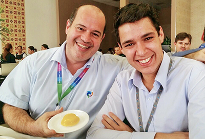 | José Francisco Miranda, executivo da DSM, em restaurante da empresa, mostra uma das sobremesas com ovo |