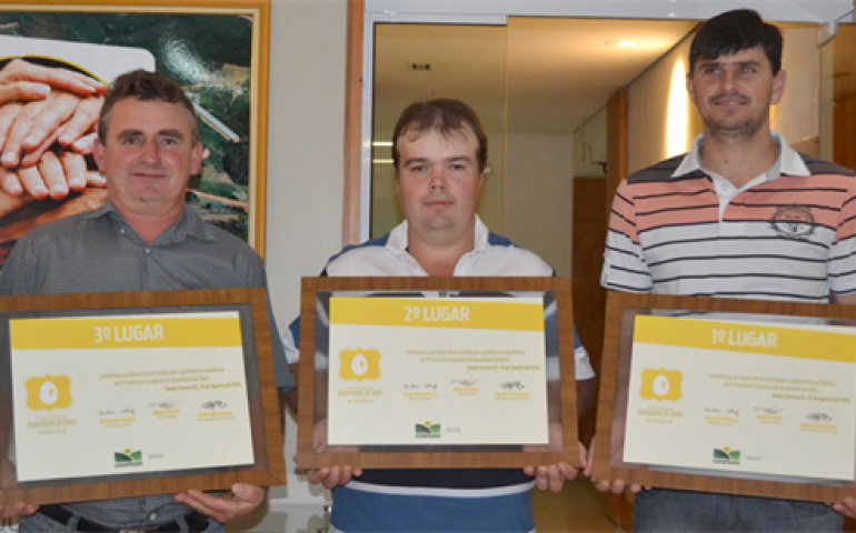 Edvan Kruger, Marciano Lemke e Valdir Kosanke foram os três avicultores premiados na primeira edição do Concurso de Qualidade de Ovos do Espírito Santo. Eles receberam prêmios pelo primeiro, segundo e terceiro lugares, respectivamente. A primeira edição do concurso aconteceu no dia 15 de agosto, durante a IV Semana Tecnológica do Agronegócio, realizada entre os dias 12 e 15. A organização foi da Coopeavi, a cooperativa da região de Santa Maria de Jetibá – maior produtor de ovos do Espírito Santo - que congrega avicultores de postura, entre outras atividades agropecuárias da serra.