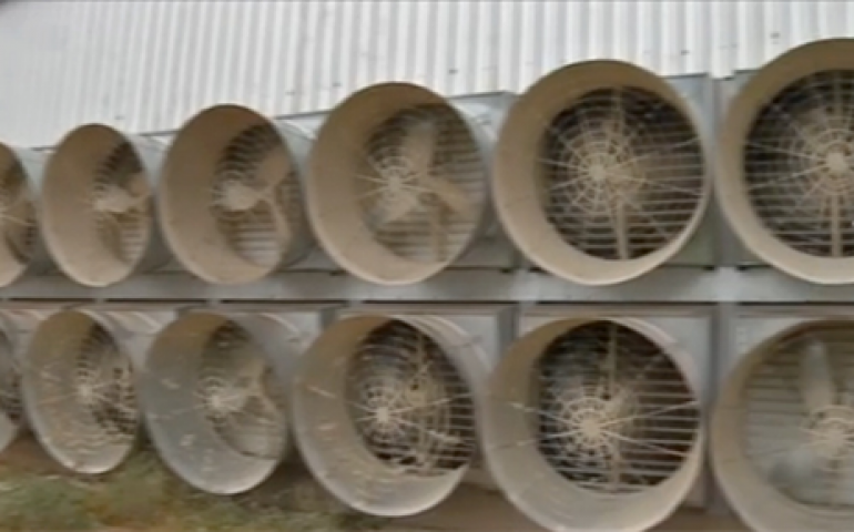 Para diminuir os efeitos do calor sobre as aves, outra granja da região investiu em barracões com climatizadores. A temperatura é pelo menos 10 graus mais baixa do que no ambiente externo. Foram 14 exaustores colocados no galpão, investimento de mais de um milhão de reais para garantir a produtividade.