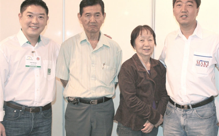 | Kleber Watanabe, da Poli-Nutri, com Katsuhide, Yukiko e Christian Maki: destaque em ovos vermelhos |
