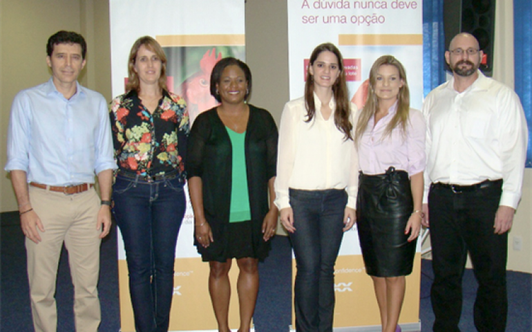 | Equipe da IDEXX com a especialista Naola Ferguson (a terceira da esquerda para a direita): debatendo micoplasma |