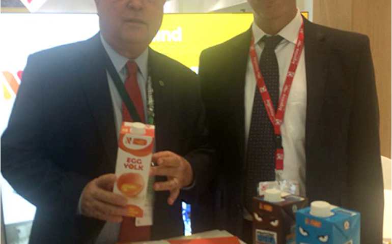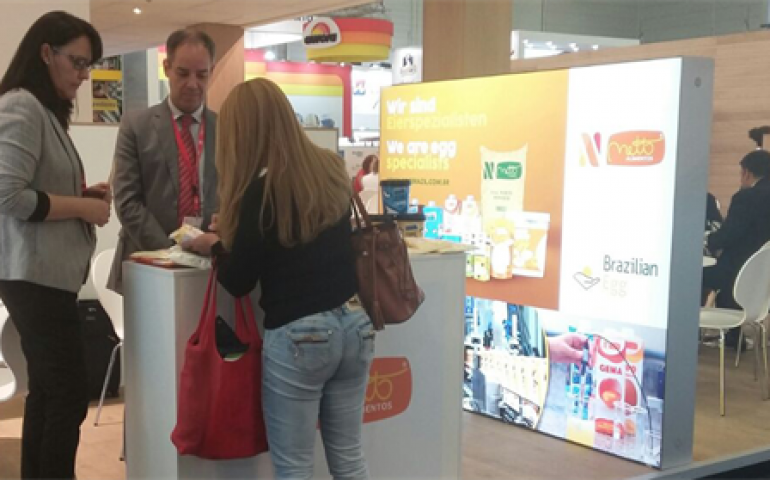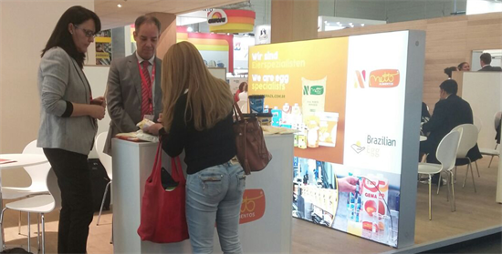 Em seu espaço no grande estande brasileiro montado durante o evento, em Colônia, na Alemanha, a equipe da empresa promove sua linha completa de ovoprodutos.