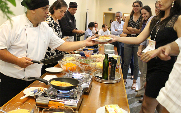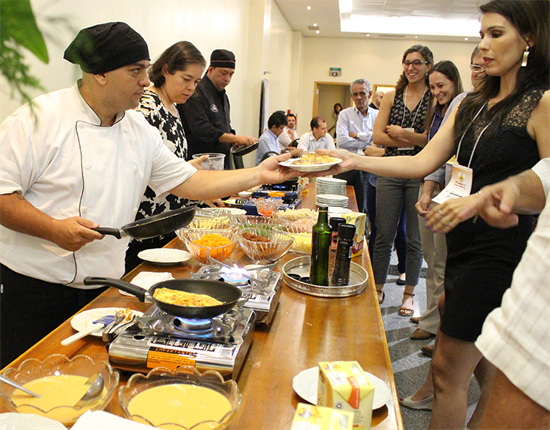 | Mesa da omelete foi um dos destaques da noite com happy hour e jantar |