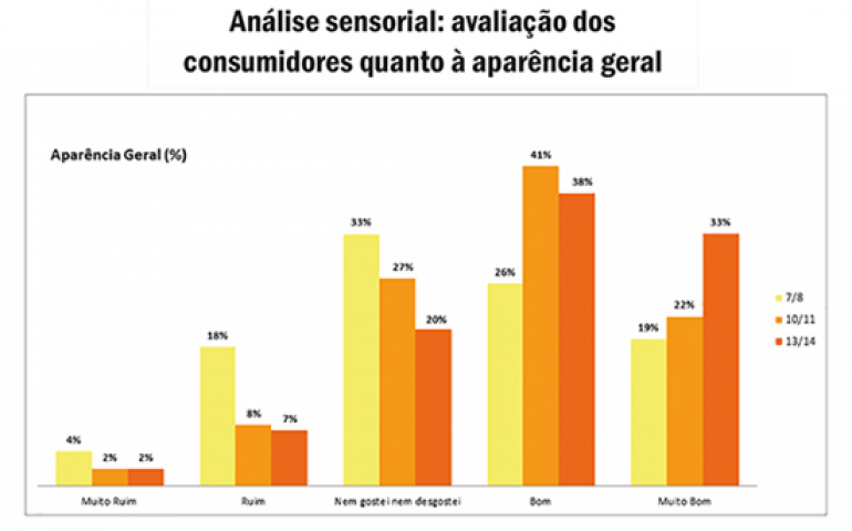 Quanto à aparência geral, foram obtidos valores próximos aos da coloração da gema, sendo um forte indicativo de que o consumidor associa aparência diretamente com a coloração da gema.