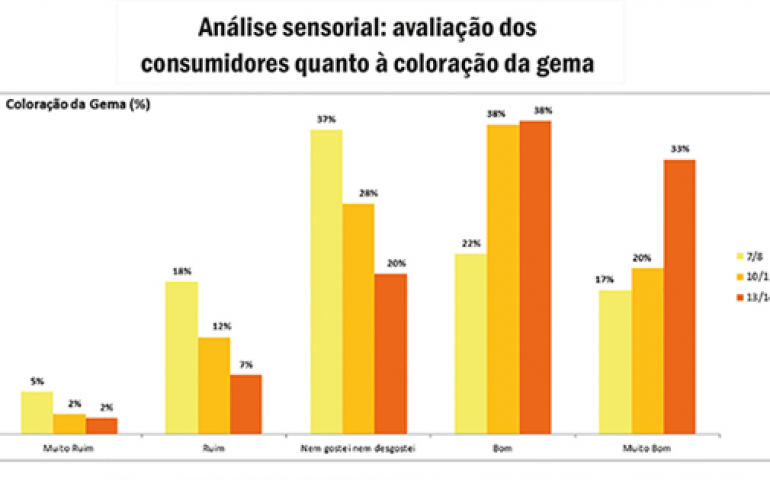 Em relação à coloração da gema, os ovos com colorações 10/11 e 13/14 tiveram as melhores avaliações. As gemas de tom laranja intenso (13/14) foram consideradas como boa ou muito boa por 71% dos entrevistados. Em relação aos ovos com coloração 10/11, 58% dos entrevistados avaliaram na mesma faixa de nota. Já os ovos de menor coloração tiveram certa insatisfação no geral, sendo que 60% das respostas estavam distribuídas entre muito ruim, ruim e indiferente.