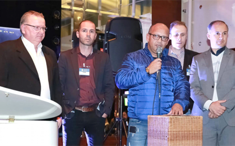 | José Eduardo dos Santos recepciona os convidados, em coquetel no dia 11, ao lado dos parceirosde organização: Ricardo Santin (Instituto Ovos Brasil), Cesar de Anda (International EggComission), Nestor Freiberger (Asgav) e Francisco Turra (Associação Brasileira de Proteína Animal) |