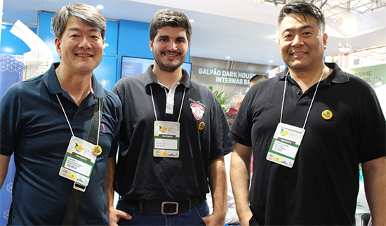| O avicultor bastense Sérgio Kakimoto com Gustavo Araújo e Alexis Carfantan, da Novogen |