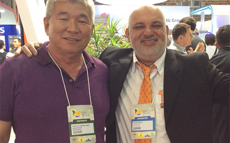 | Nilson Tadashi Dakubara e Welington Tacahashi, da ATI Plasson, recebem seus clientes |