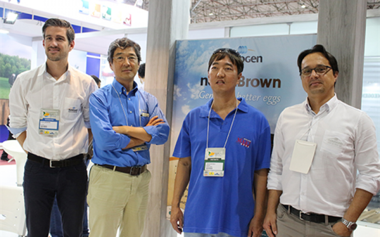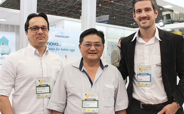 | A equipe Novogen recepcionou com orgulho o avicultor Christian Maki em seu estande.Maki foi bicampeão em ovos vermelhos no Concurso de Bastos, com a ave Novogen Brown |