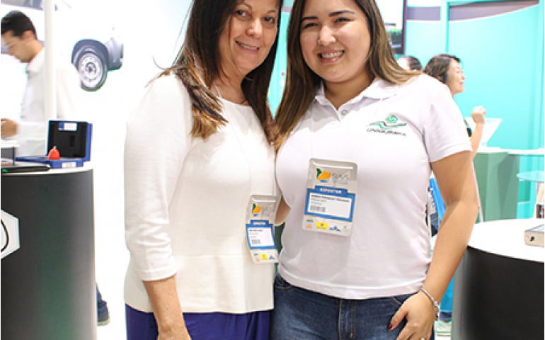 | Sonia Bazan e Jessica Takahashi, representantes da Uniquímica recebendo clientes |