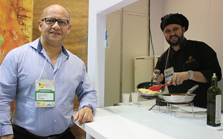 | O diretor executivo da Asgav, Eduardo dos Santos, apresenta a cozinha que levou para o SIAVS |