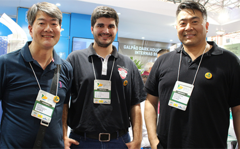 | Macoto Oide e Willian Fujikura, da Granja Fujikura - incubatório de codornas -, com o produtor Igor Straub |