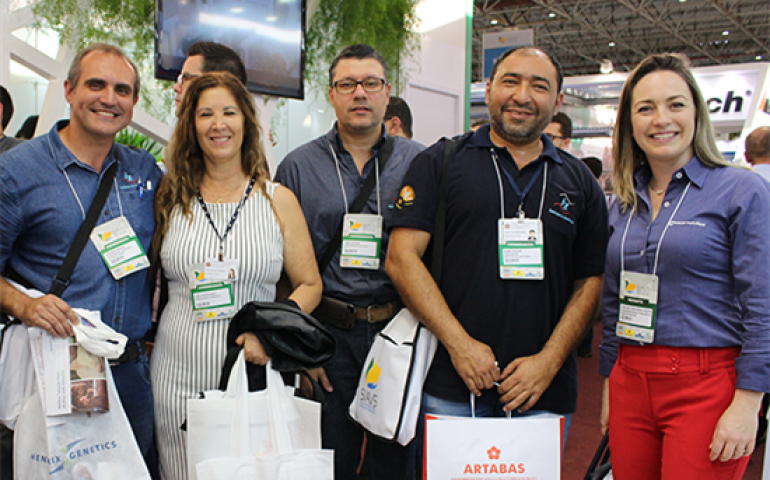 | Grupo animado na feira: Evandro Moraes, Carla Pizzolante, Fabio Budino e Weber Soares,do Instituto de Zootecnia, com Karol Von Zuben, da Trown Nutrition |