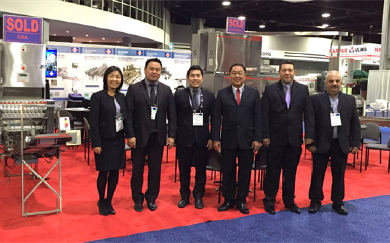 | A equipe da Yamasa em Atlanta: Elisabeth Yamasaki, Nelson Yamasaki Júnior, Alberto Yamasaki, Nelson Yamasaki - presidente da empresa, Manoel Fernandes e Daniel Filacio |