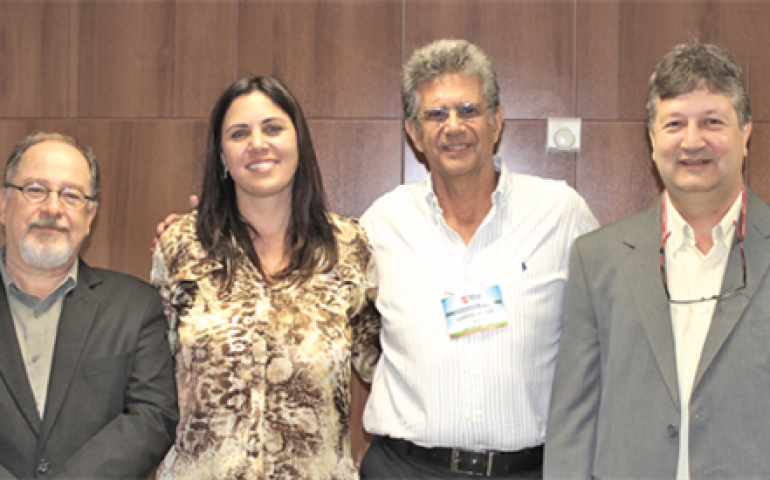 | Os palestrantes Jânio Santurio, Elizabeth Santin e Antônio Piantino com Gabriel Jorge Neto, da YES |