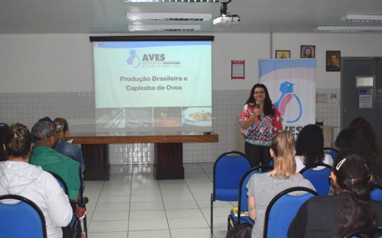 Aline Nitz abriu o ciclo de palestras falando sobre A produção brasileira e capixaba de ovos. Ela levou aos alunos informações importantes como a de que o Espírito Santo é o terceiro maior produtor de ovos do país, com 13 milhões de unidades produzidas por dia no Estado. E Santa Maria de Jetibá, município localizado na serra capixaba, é o maior produtor de ovos do Brasil.