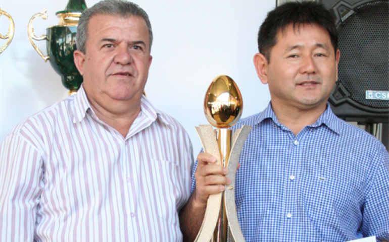 | 2º lugar Ovos Vermelhos - Granja Ueyama: Paulo Ueyama com Patrocínio M. Filho (Presidente da Câmara Bastos) |