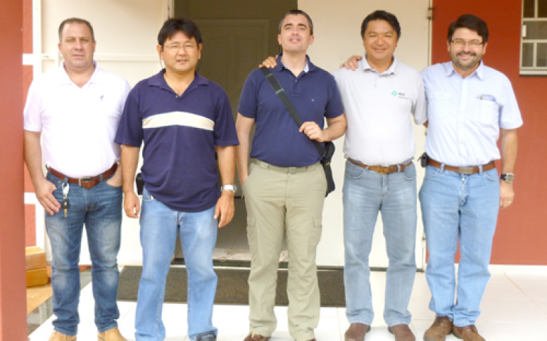 | Sebastián e Octávio Rech, da Isa/Hendirx, com o avicultor Lauro Morishita e Fábio Katayama |