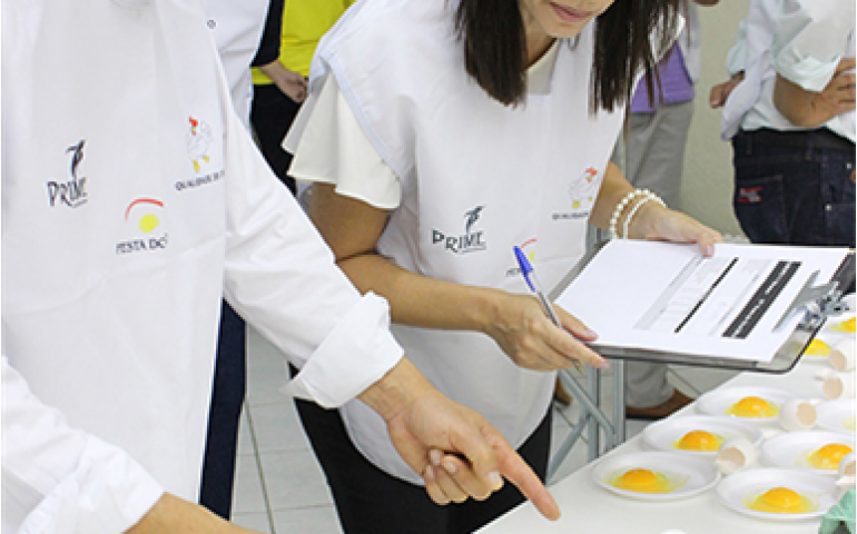 Resistência da casca (>= 5,50 kgf); Espessura da casca (>= 0,47 mm); Unidade Haugh (>= 90,0 UH para ovo vermelho / >= 95,0 UH para ovo branco); Cor da gema (8,0 a 10,9 para ovo branco / 9,0 a 11,9 para ovo vermelho), de acordo com o leque de cores da DSM (antigo leque da Roche).