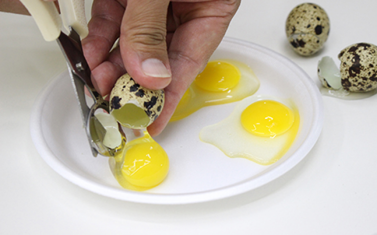 17.1. Os OVOS DE CODORNA serão cortados por tesouras apropriadas próximo à extremidade do bico. A medição da espessura da casca do ovo de codorna será feita na casca COM a membrana, devido a dificuldades operacionais. Será medido um fragmento da borda da parte maior do ovo de codorna em análise.
