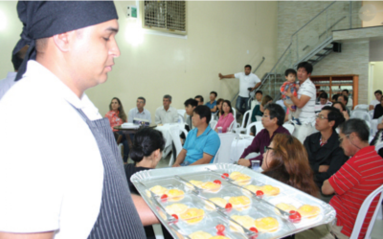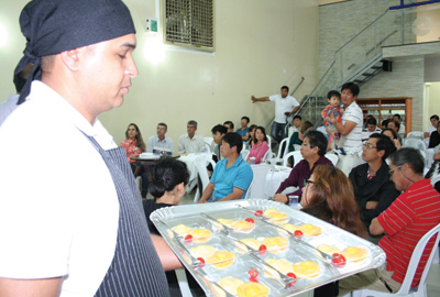 | Avicultores e técnicos assistem ao preparo da massa especial com ovos diferenciados |